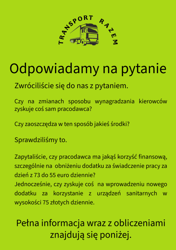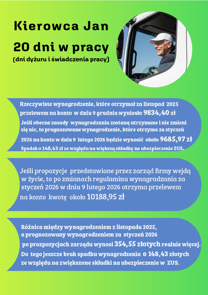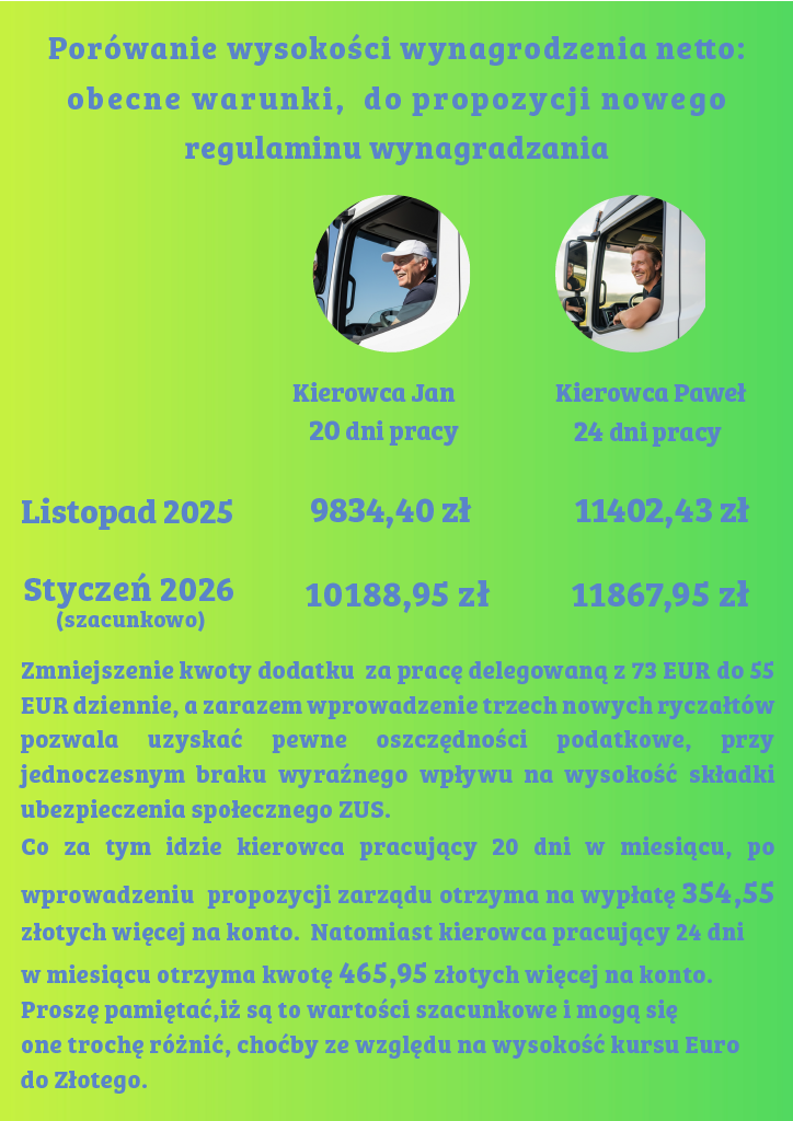 Dzięki temu zauważycie nieduży, ale jednak realny miesięczny wzrost wynagrodzenia już w 2026 roku. Oszacowaliśmy to na kwotę 2800 złotych rocznie dla kierowcy. To mogą być Wasze pieniądze. Dlaczego mamy z nich zrezygnować?