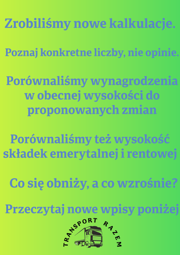 Uniknięcie spadku wynagrodzenia o zwiększoną składkę na ubezpieczenia społeczne o około 148 złotych. Brak wprowadzenia nowych warunków wynagradzania spowodowałby realny spadek wynagrodzenia kierowcy o 148 złotych miesięcznie. Wówczas w kolejnym rok wynagrodzenie kierowców uległoby zmniejszeniu. Tego chcemy przecież uniknąć.