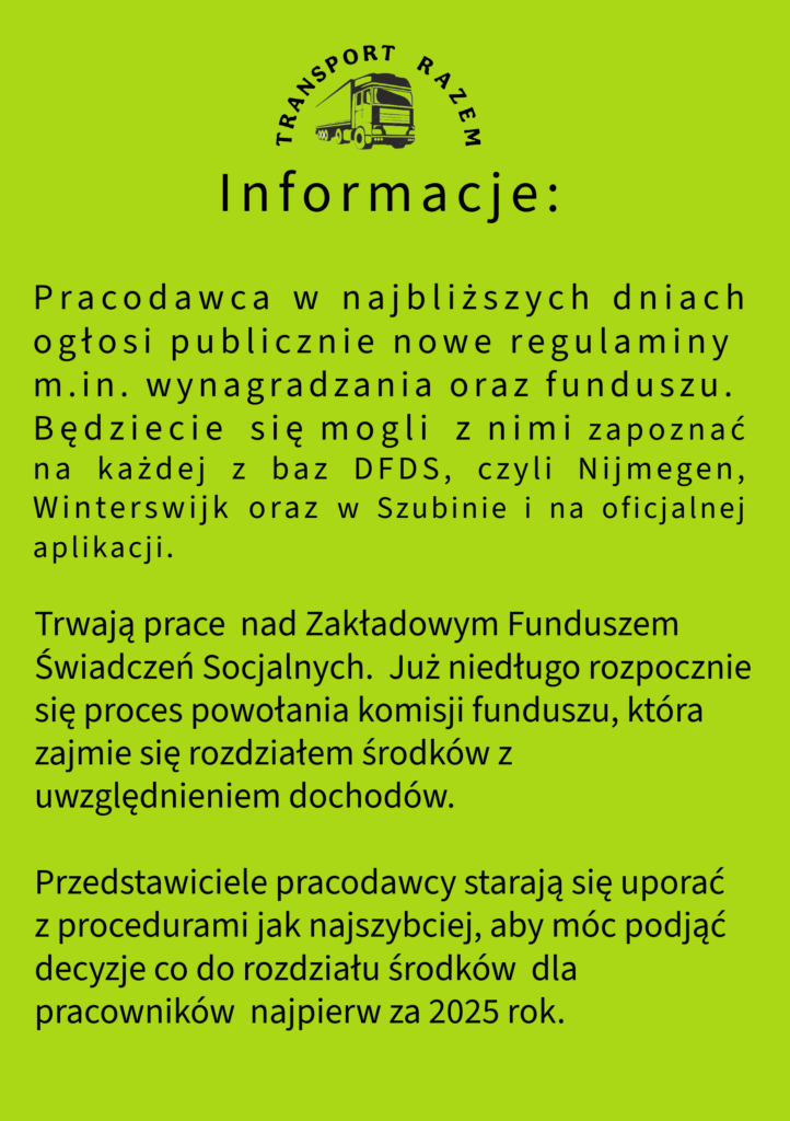 Podobnie sytuacja wyglądała z wprowadzeniem w 2025 roku Zakładowego Funduszu Świadczeń Społecznych z odpisem w wysokości 1000 złotych na pracownika. Jako związek zawodowy Transport Razem podpisaliśmy porozumienie w tej sprawie z zarządem DFDS Logistics Polska.
