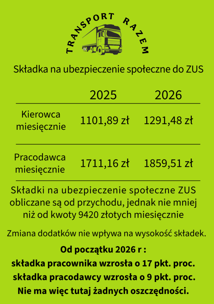 I teraz najważniejsza rzecz: podstawą do wyliczenia składki ZUS dla kierowców międzynarodowych jest prognozowane wynagrodzenie w gospodarce narodowej, które od 1 stycznia 2026 roku wynosi 9420 złotych. W porównaniu do roku 2025 wzrosło ono o kwotę 747 złotych.