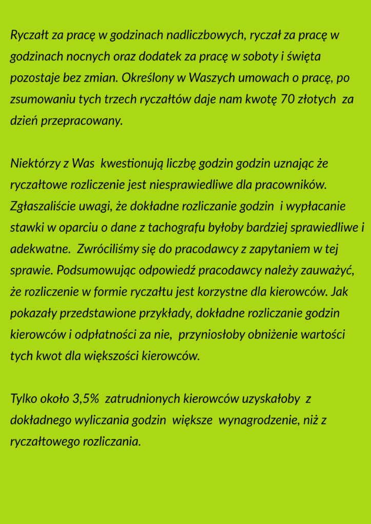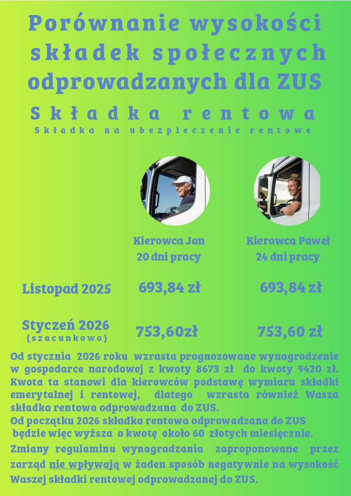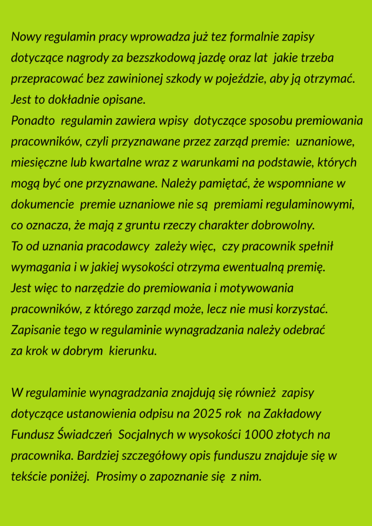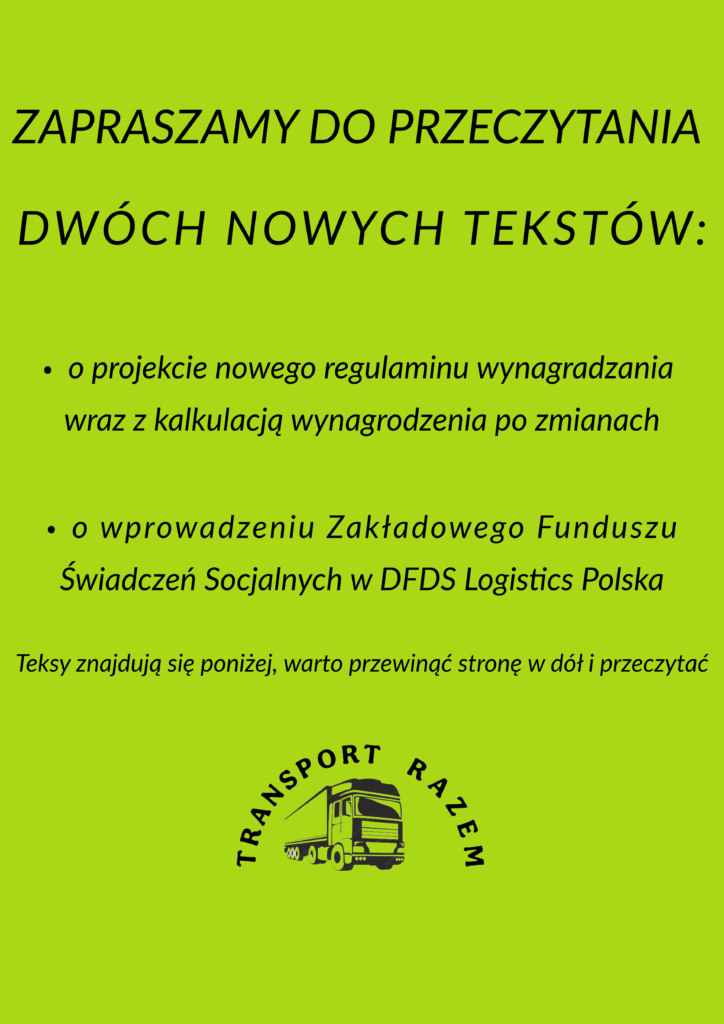 Podjęte w ostatnich miesiącach rozmowy oraz konsultacje z zarządem firmy zaowocowały podpisaniem przez nasz związek (Transport Razem) porozumienia w sprawie wdrożenia Zakładowego Funduszu Świadczeń Socjalnych. Utworzenie Zakładowego Funduszu Świadczeń Socjalnych (ZFŚŚ) zostało urzeczywistnione w regulaminie ustalającym warunki działania tego funduszu.