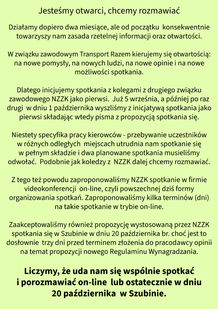 Jeśli chcecie wiedzieć więcej na ten temat i otrzymywać solidne informacje, a nie plotki i domysły to zapraszamy do członkowstwa w naszym związku Transport Razem.